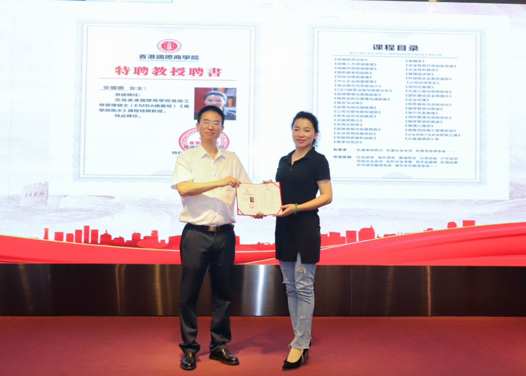 罗德达院长代表香港国际商学院向傅开虎董事长颁发香港国际商学院校董证书和特聘教授聘书,向香港得到国际集团董事长安丽娜、玖零控股集团CFO韩忠智颁发特聘教授聘书。