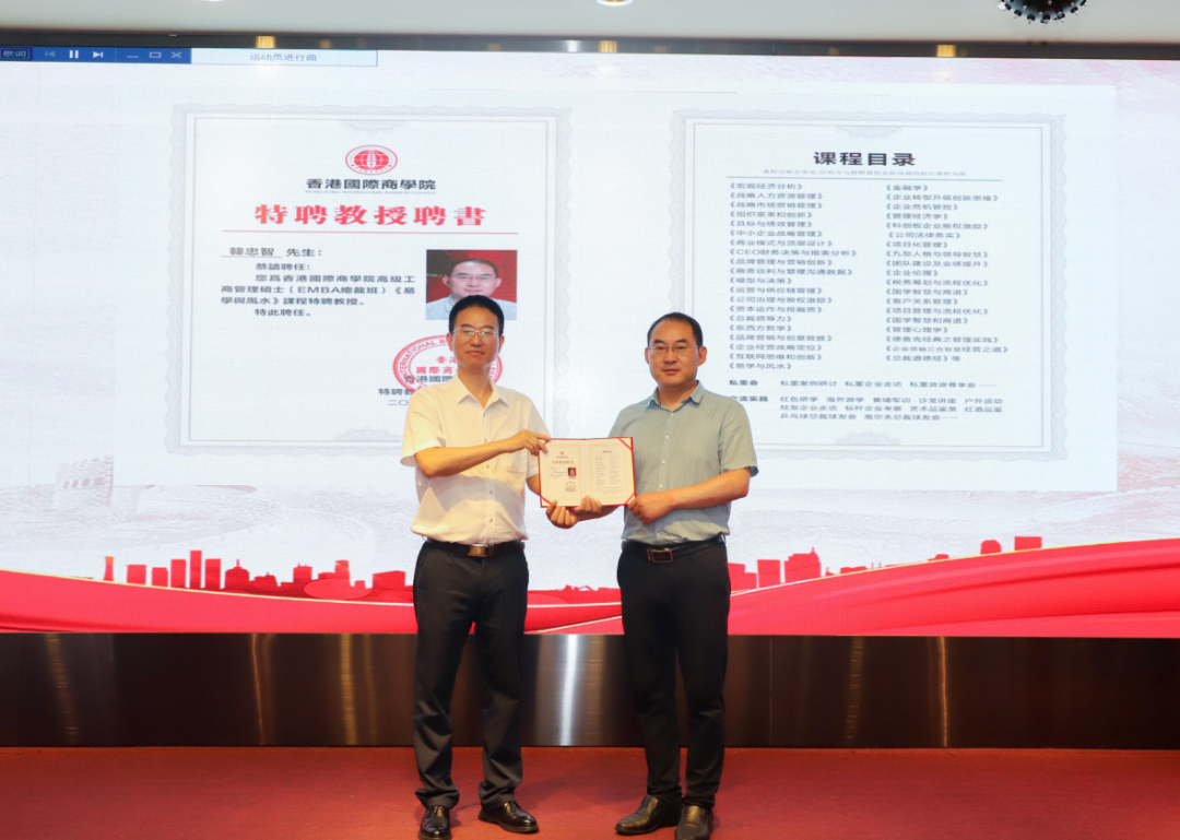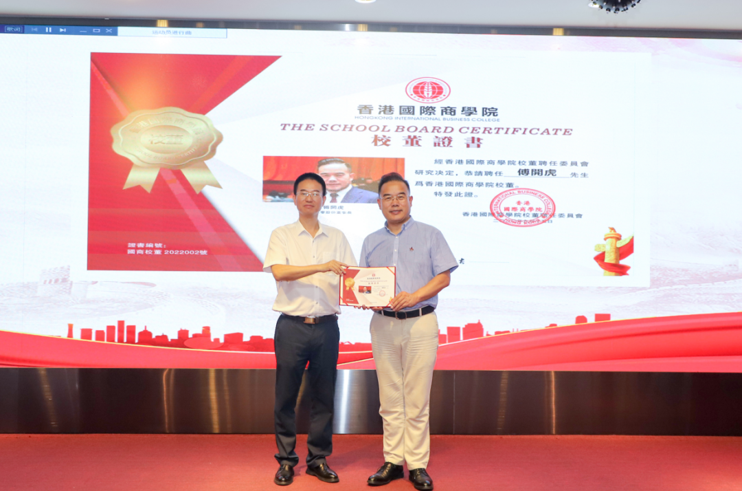 同时,香港国际商学院与玖零控股集团达成合作举行香港国际商学院企业上市研究院共识,双方签订了《香港国际商学院企业上市研究院合作协议》,全国十佳孝贤人物、玖零控股集团董事长、中关村科技企业协会副会长、第二届中关村上市协会新三板会长、文化部中国传统文化产业发展中心常务副主任、中国商业联合会副会长傅开虎先生荣任香港国际商学院企业上市研究院院长。在签约仪式上,罗德达院长为傅开虎先生颁发香港国际商学院企业上市研究院院长聘书。